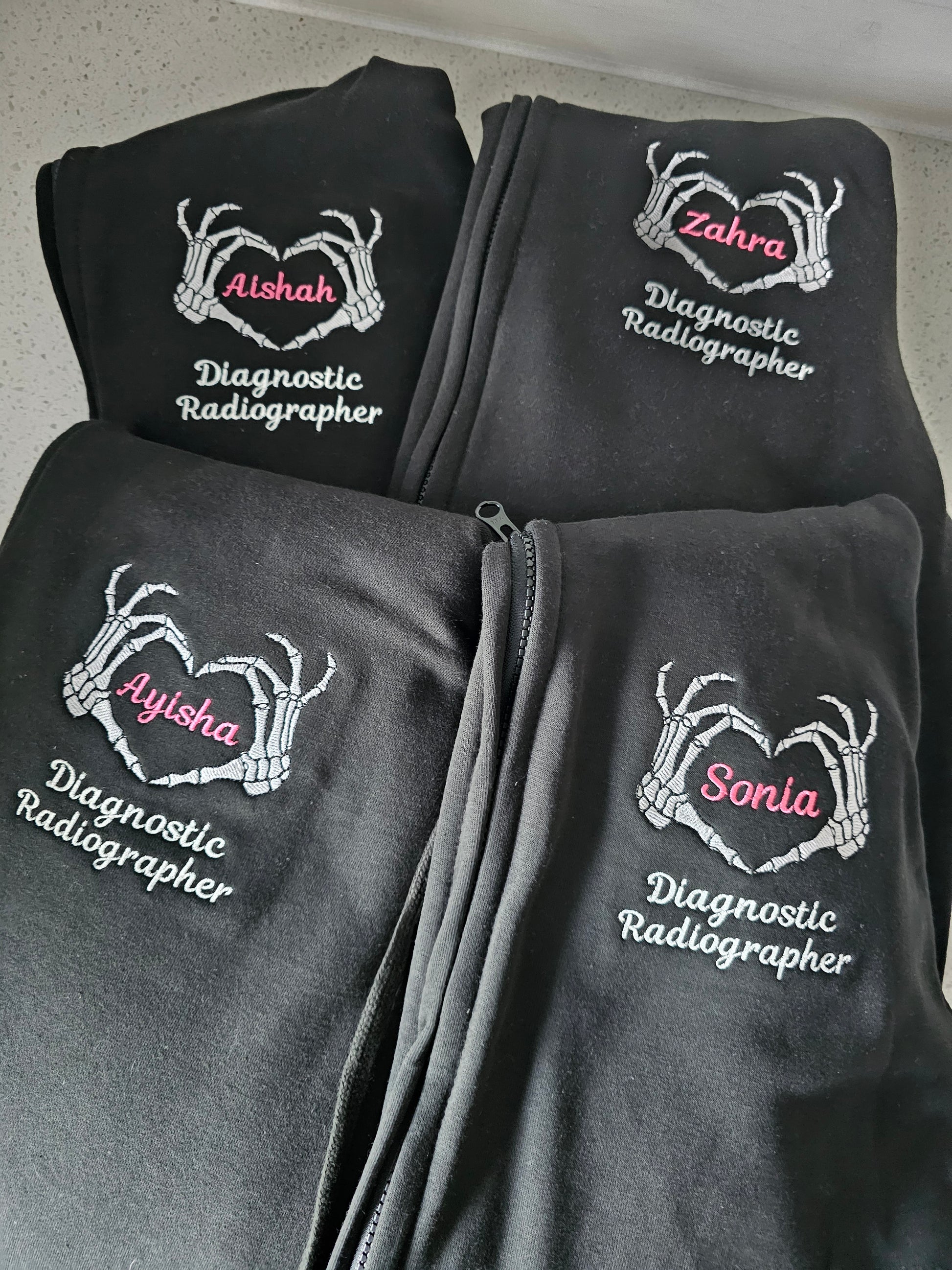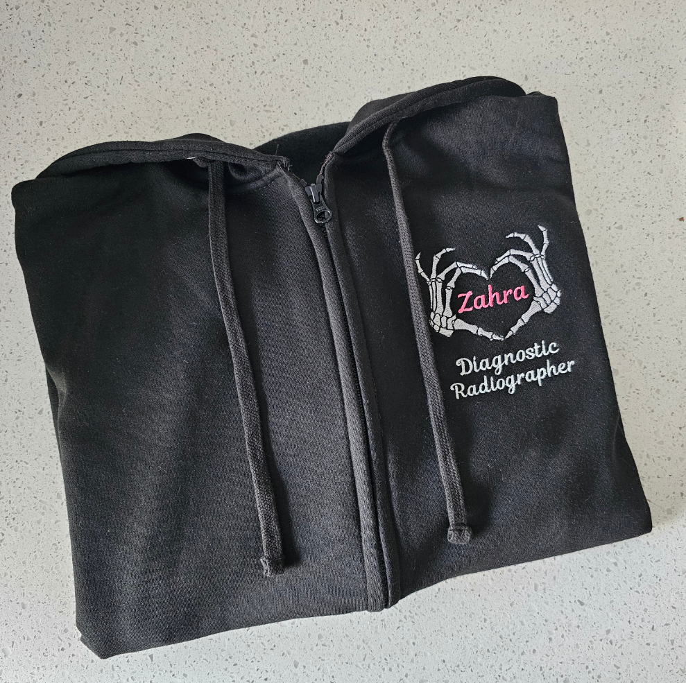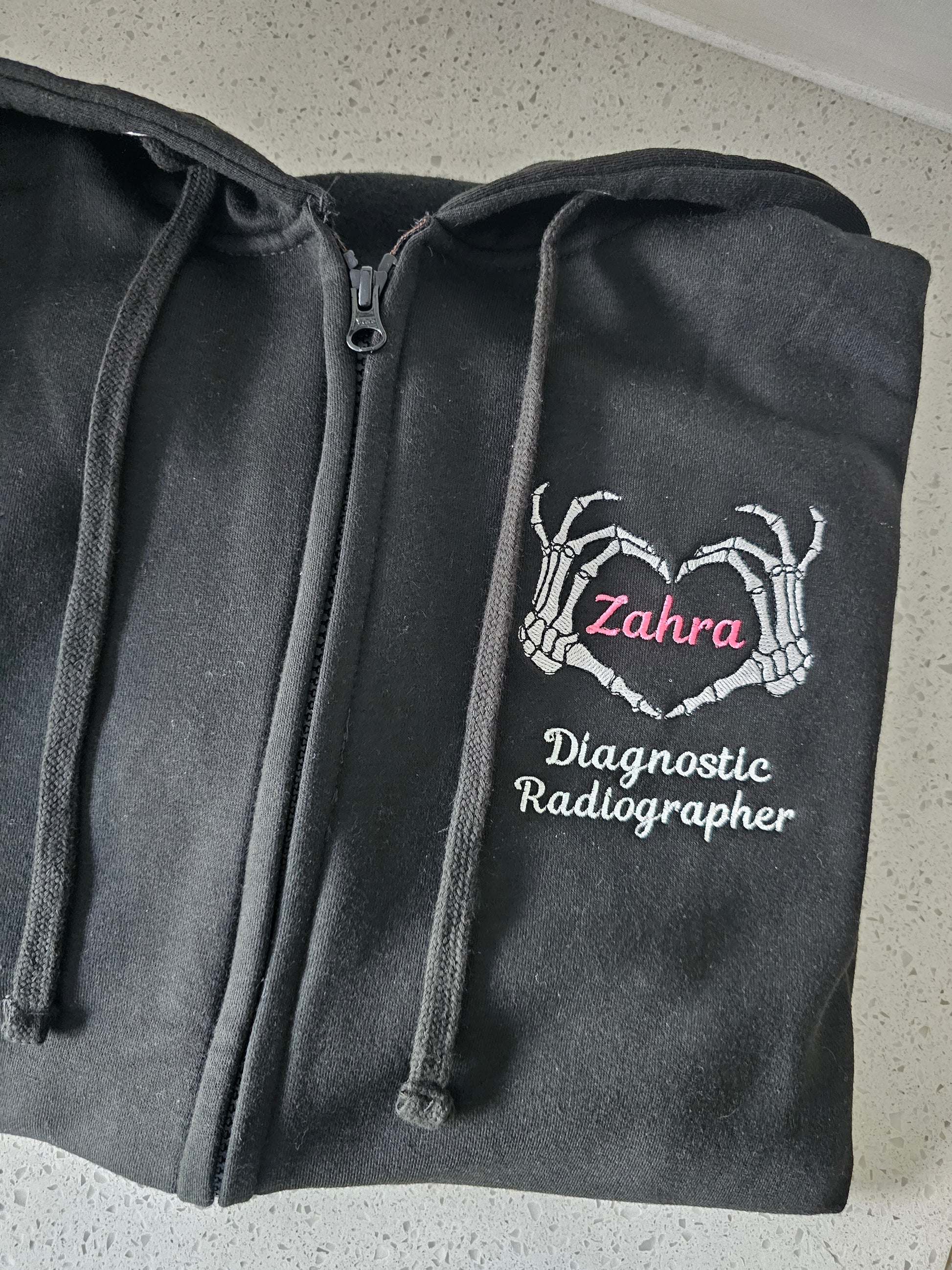 Skeleton hands in a heart shape embroidered hoodie, this is perfect for any radiographer, student, assistant, xray tech, physio or anyone who works with bones.