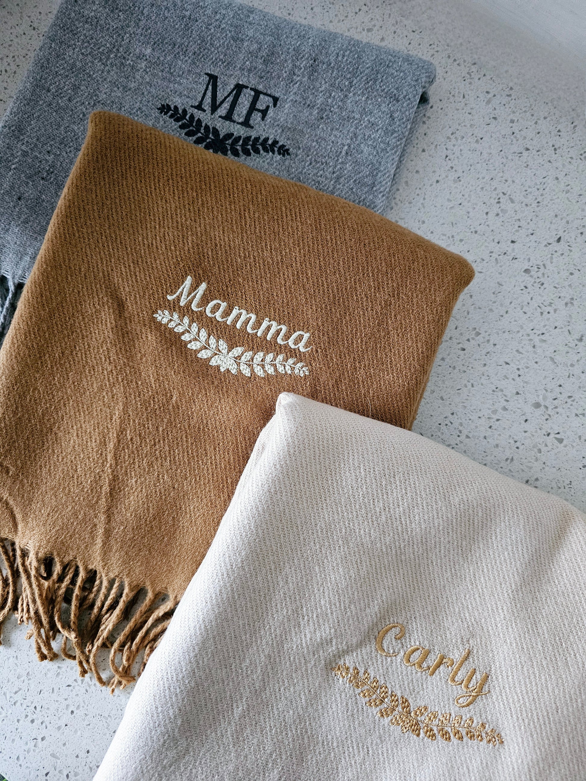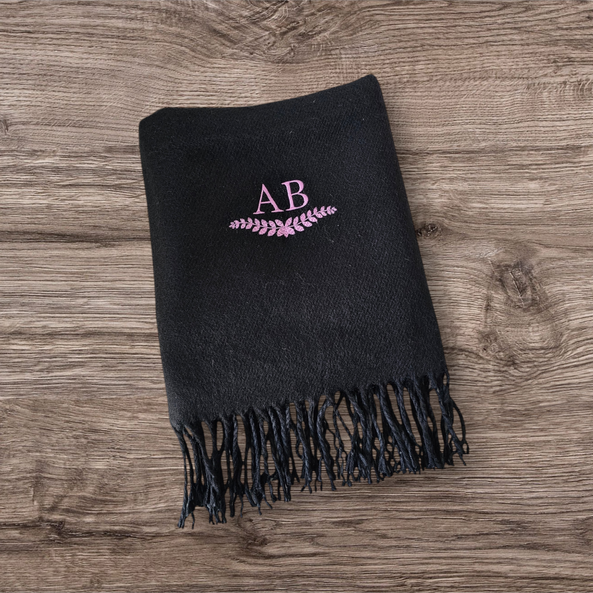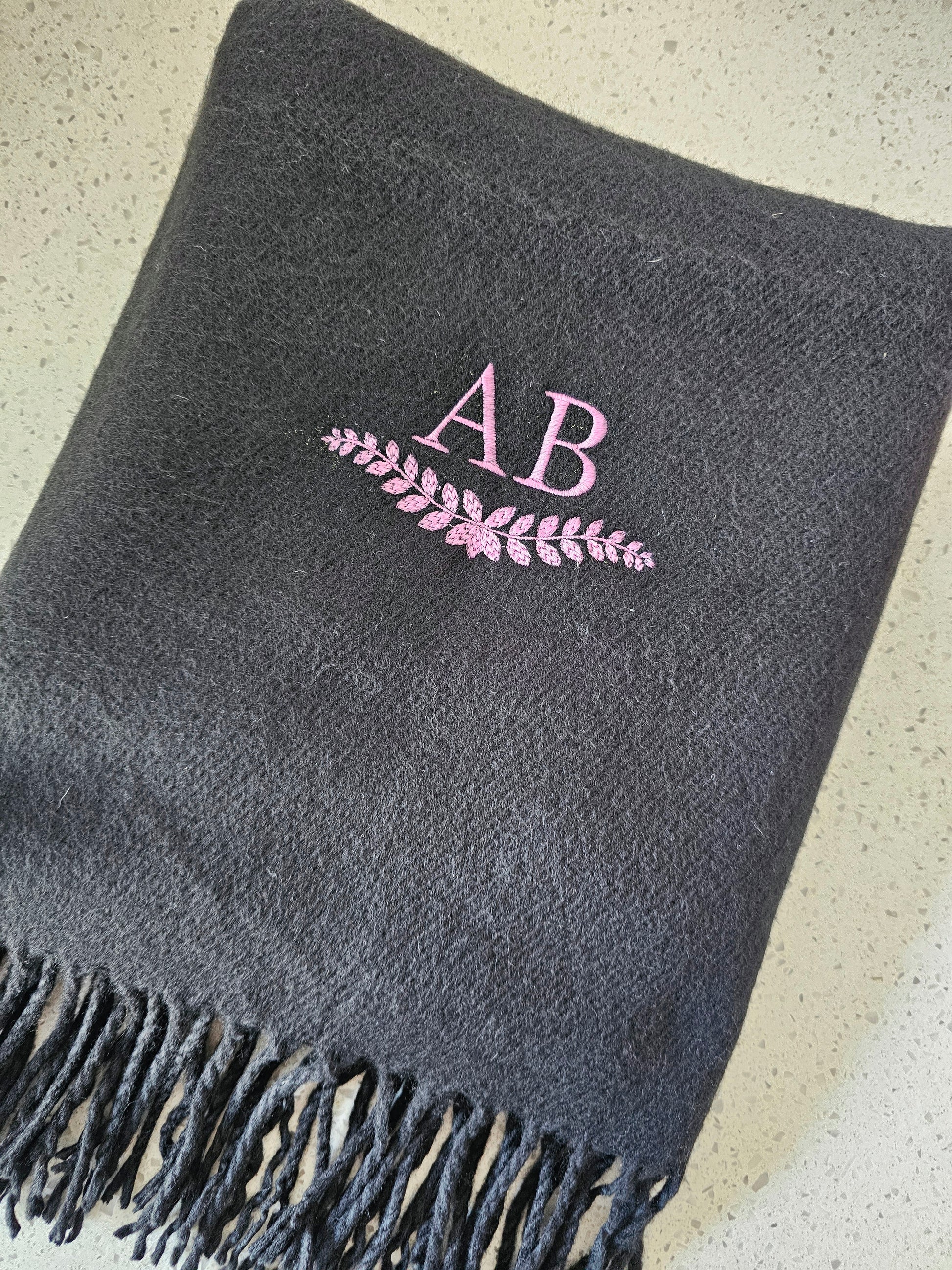 Elevate your style with our personalised embroidered scarf! Available with any name or initials, embroidered with any name or initials with a underneath leaf design, other designs available separately. Made from high quality, soft material, our scarves come in stunning colors. Perfect as a gift or a treat for yourself.