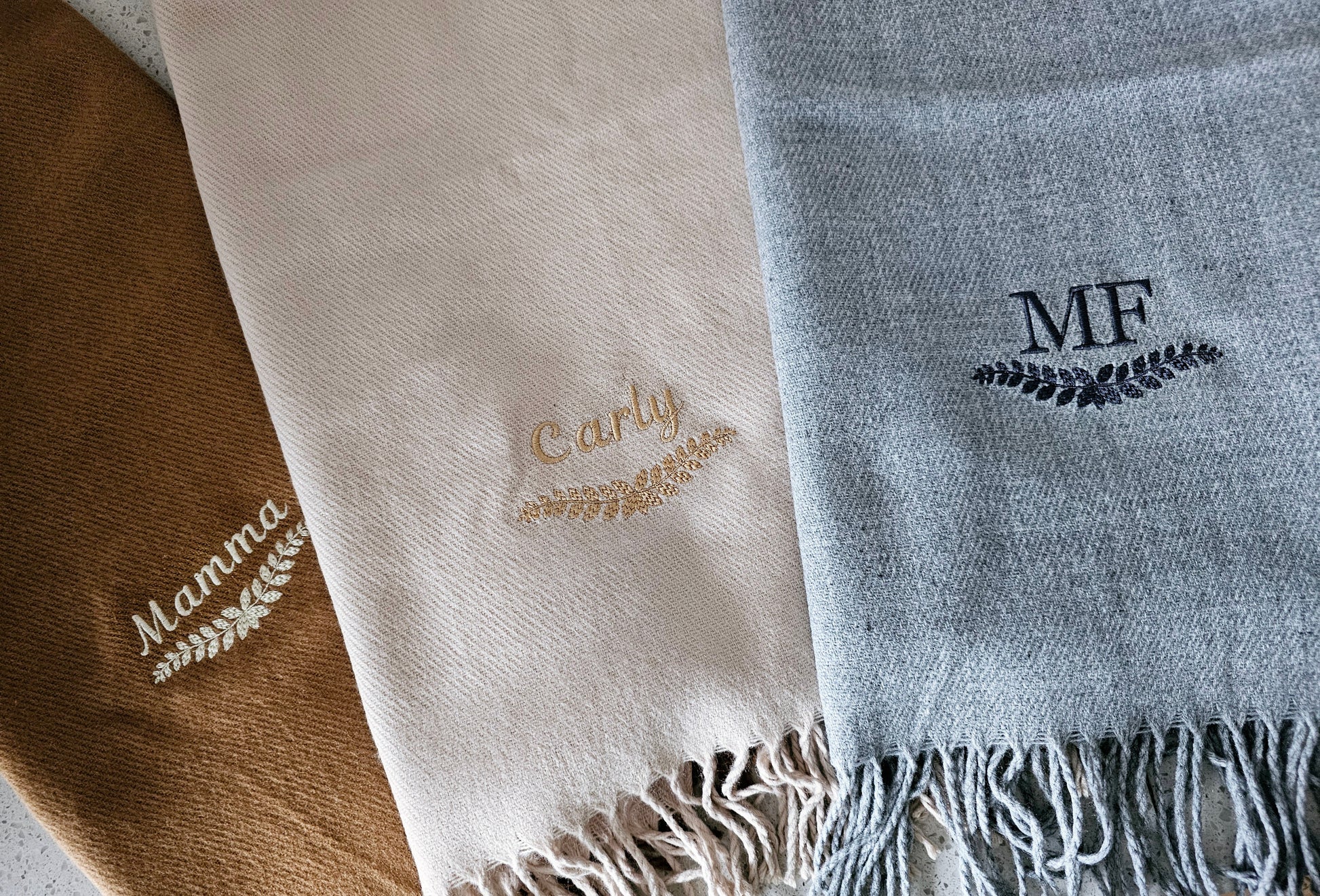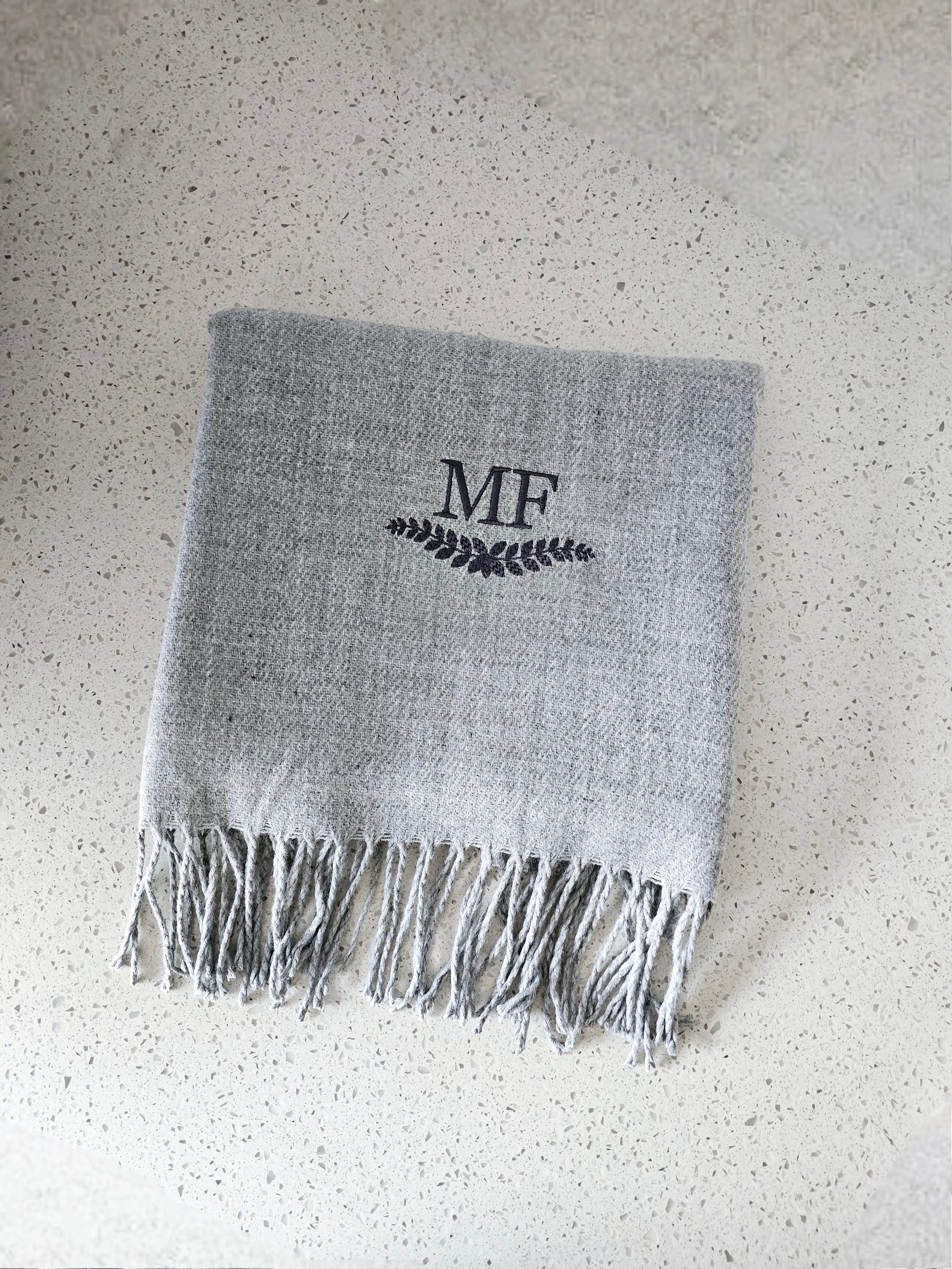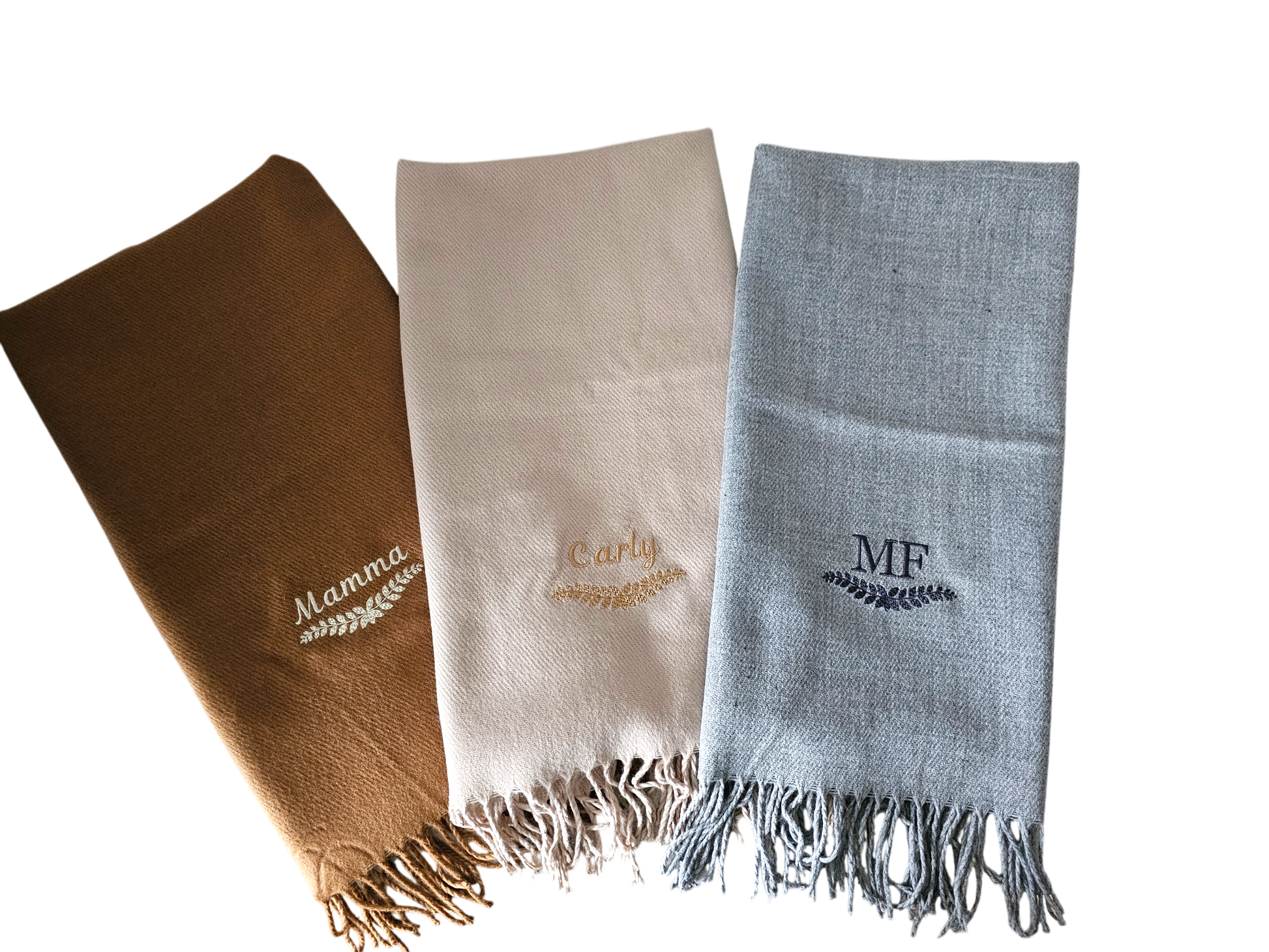Elevate your style with our personalised embroidered scarf! Available with any name or initials, embroidered with any name or initials with a underneath leaf design, other designs available separately. Made from high quality, soft material, our scarves come in stunning colors. Perfect as a gift or a treat for yourself.