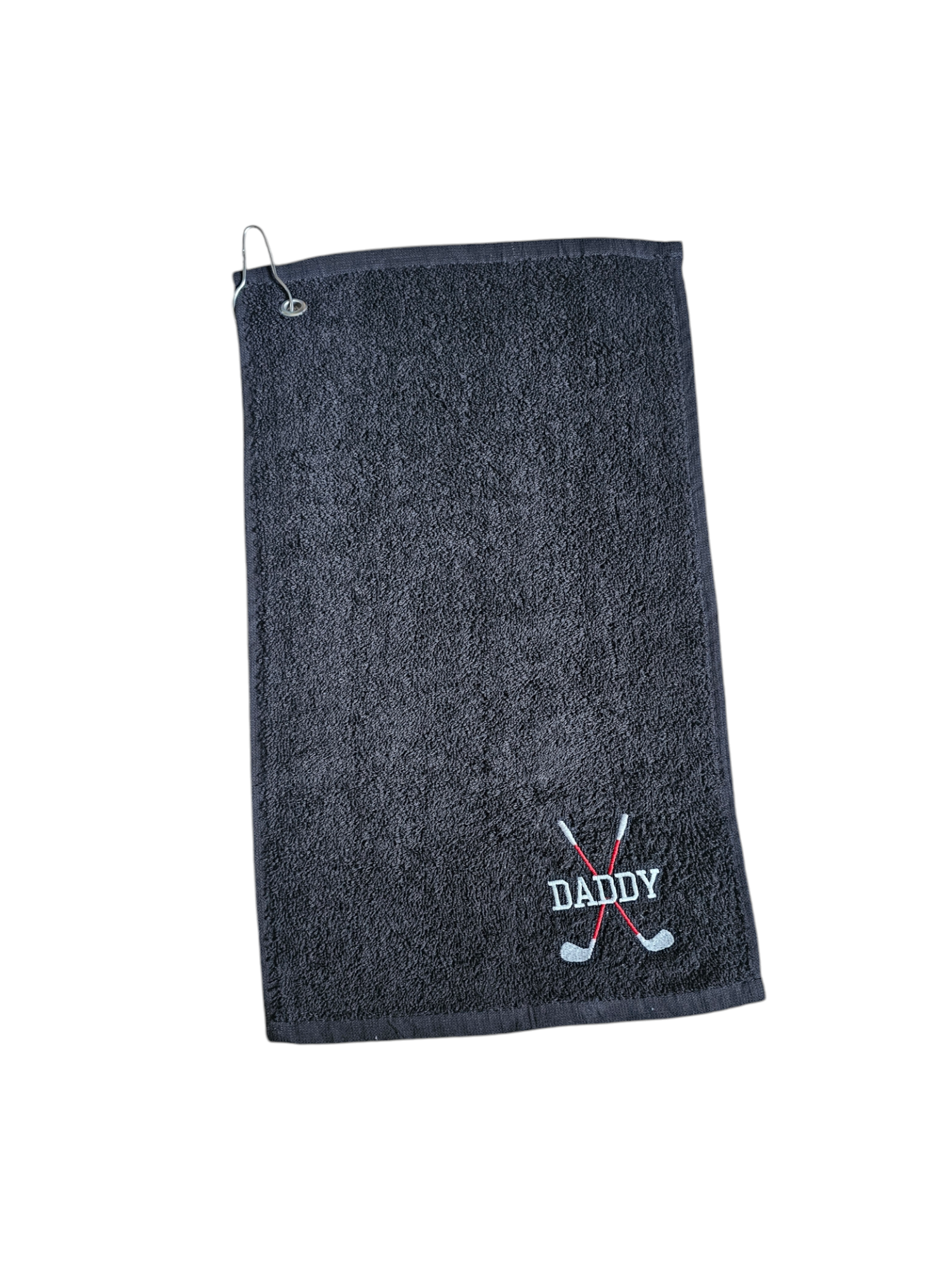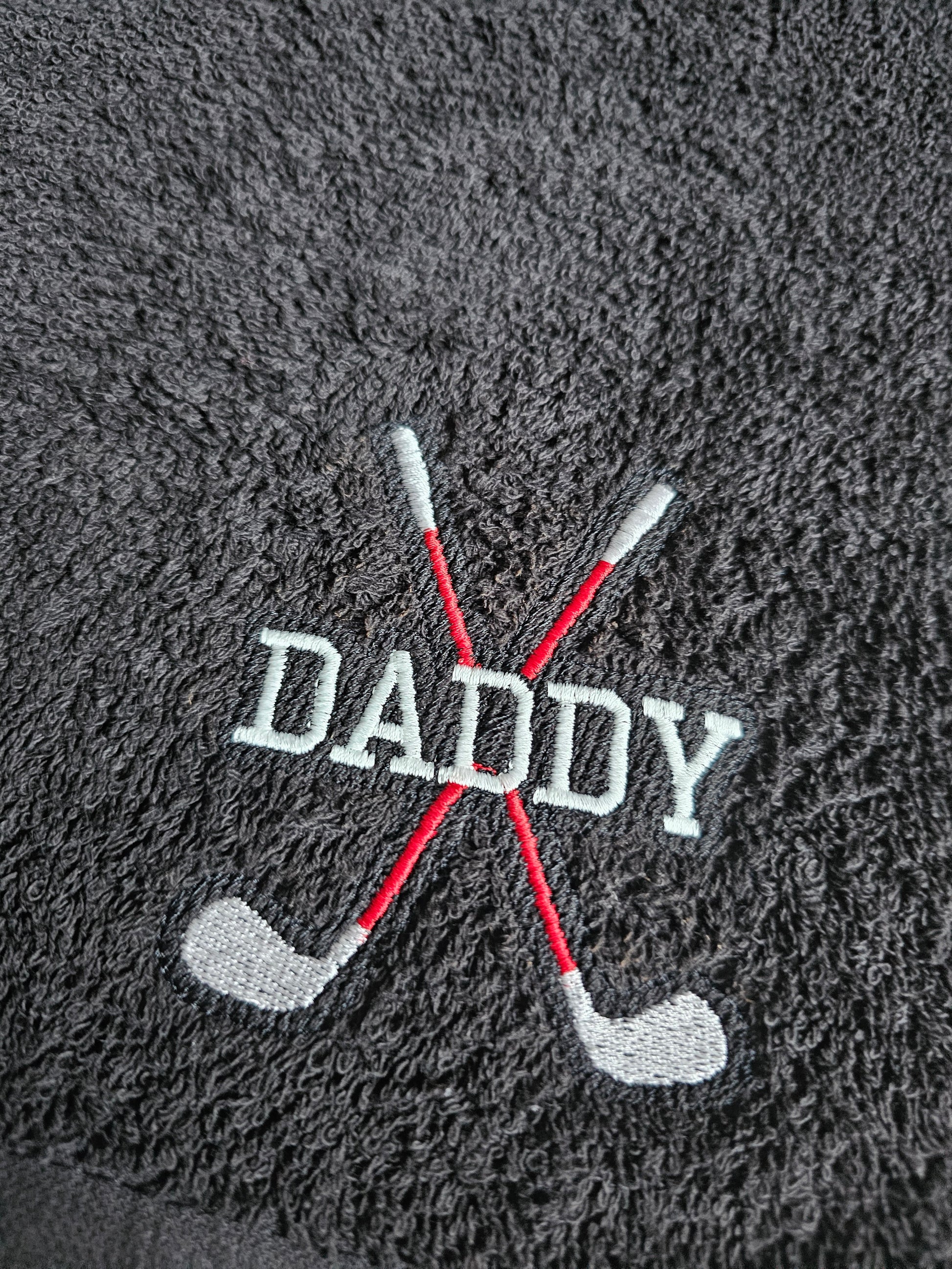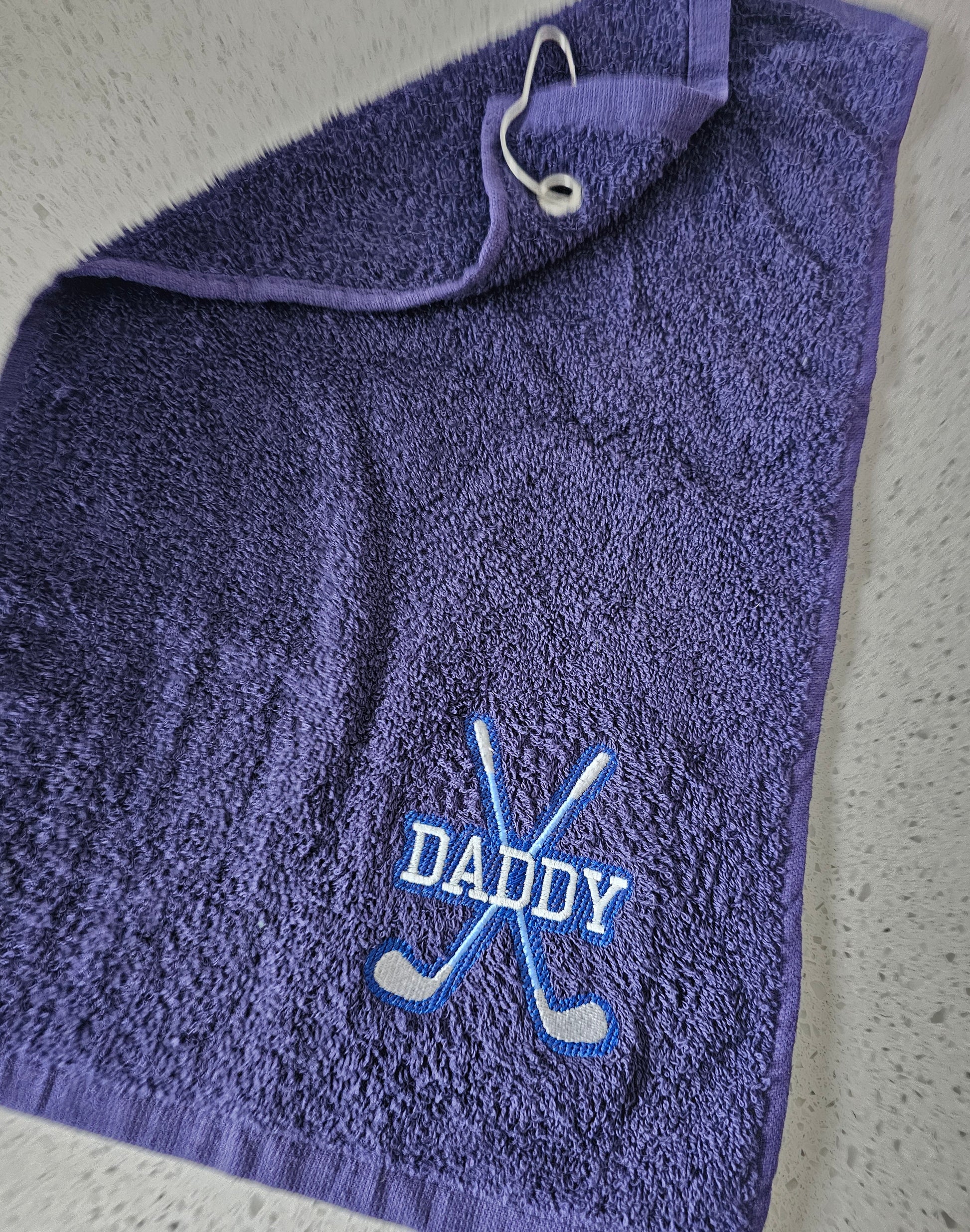 Embrodiered gold towels with any name and golf club design. Towels available in Navy, black, white, green or pink and you have the option to chanhe the golf club colours to suit yoir style. Perfect gift for any golfers these towels clean the clubs great and come with a convenient clip to attach it to a golf bag.