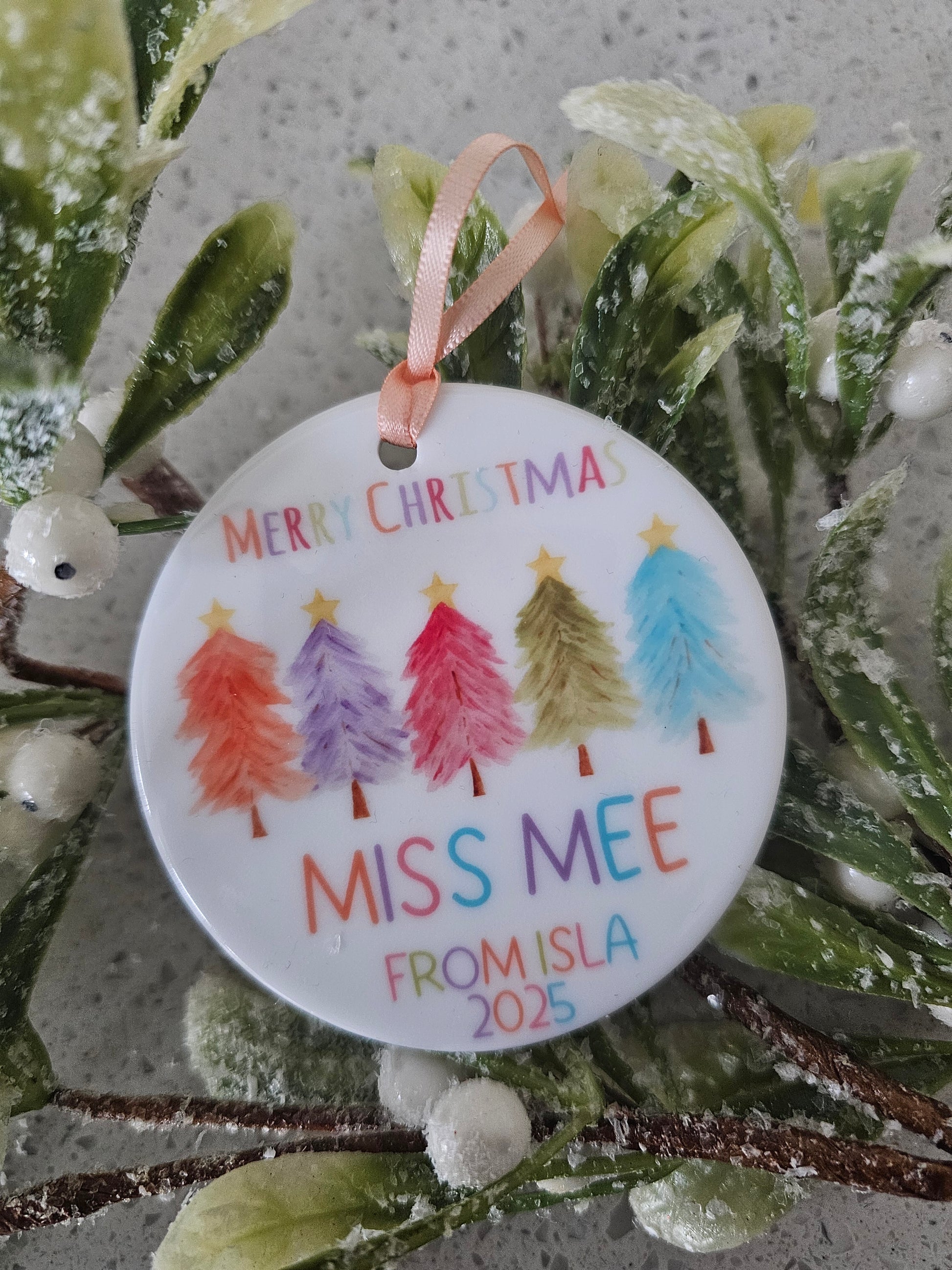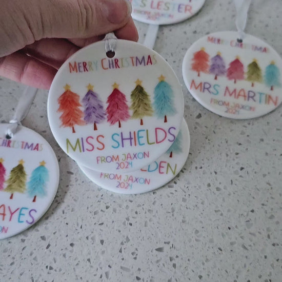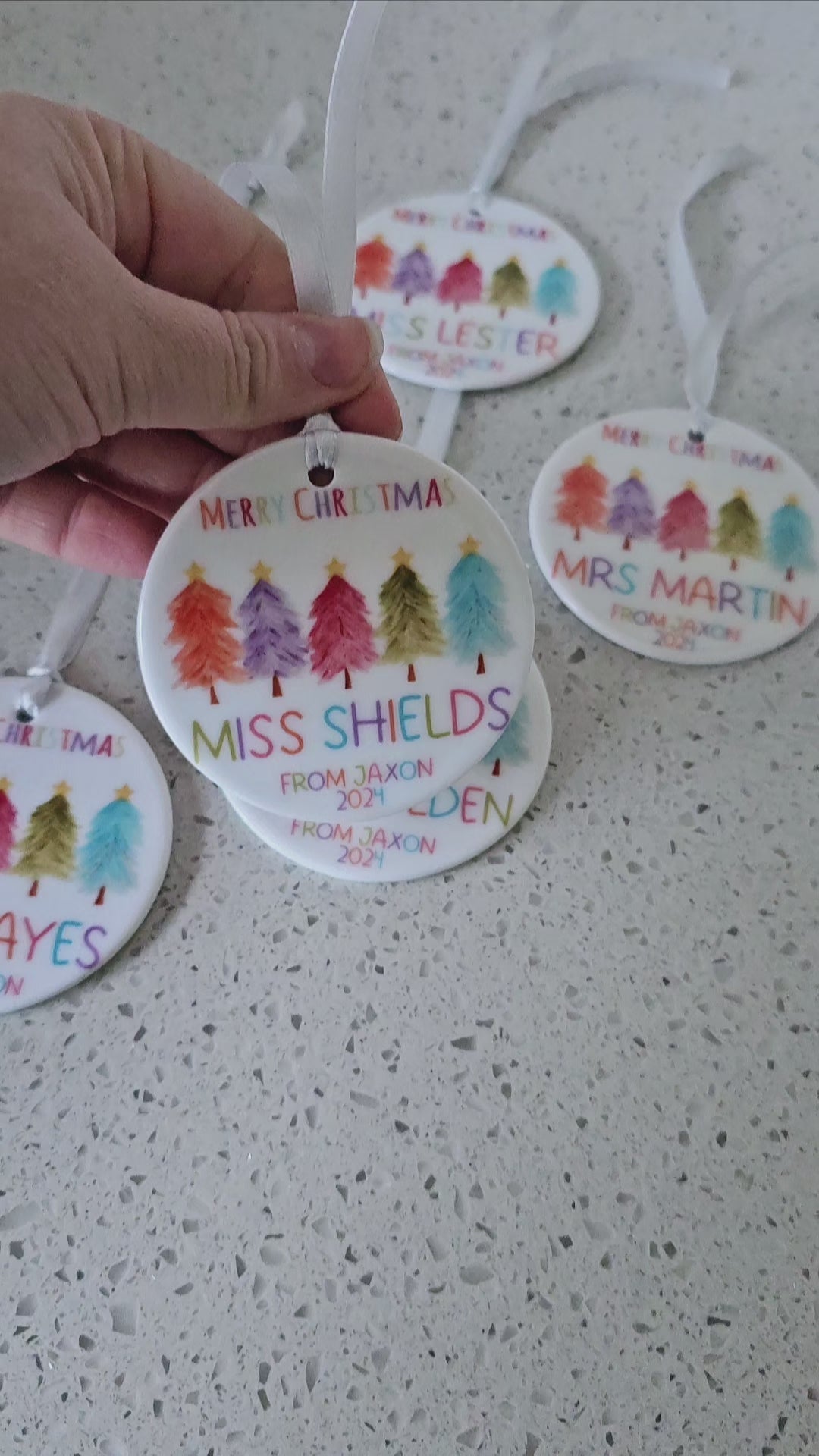 A personalised ceramic bauble with a cute pastel christmas tree design personalised with any teacher and child name with year.