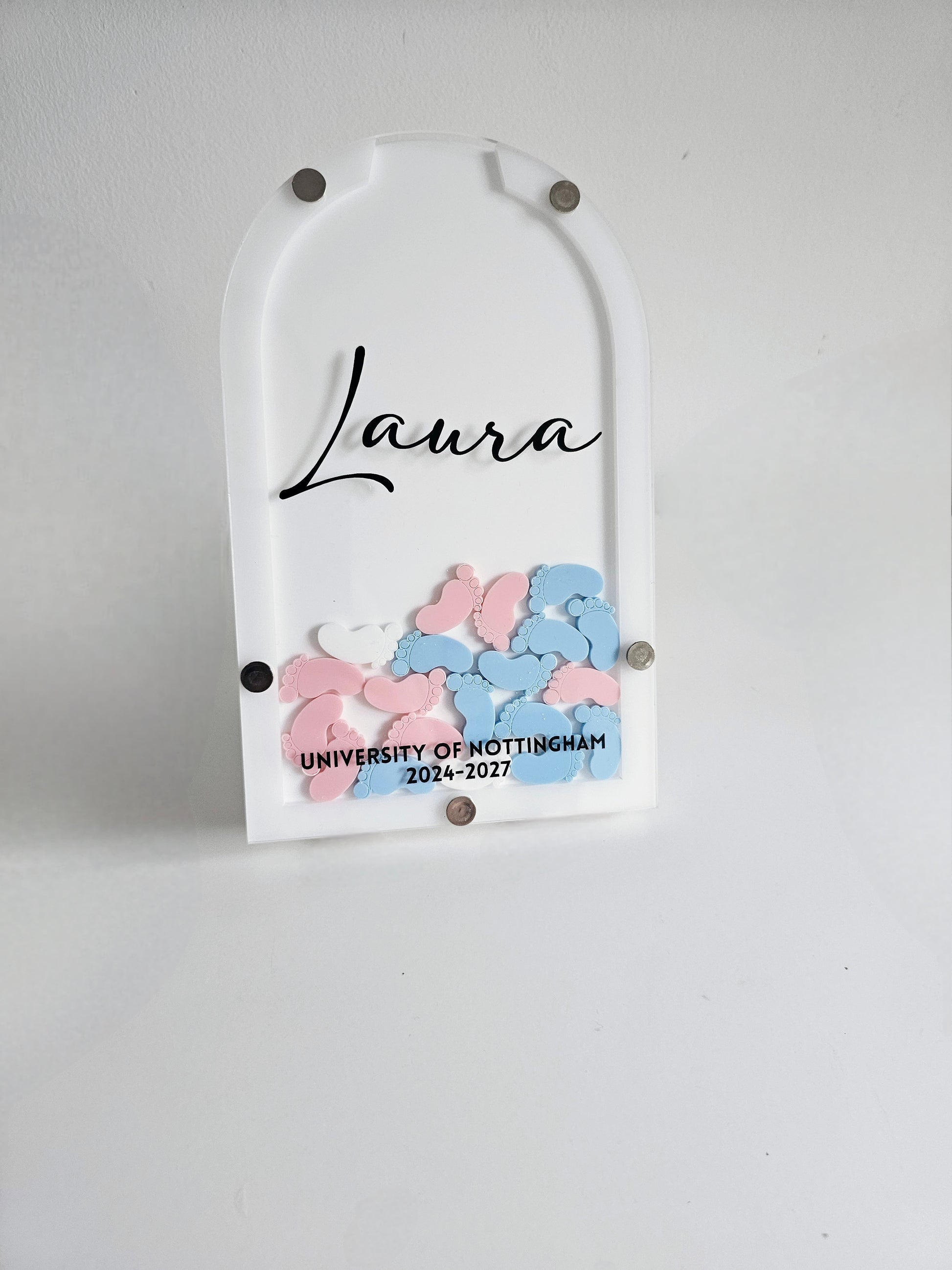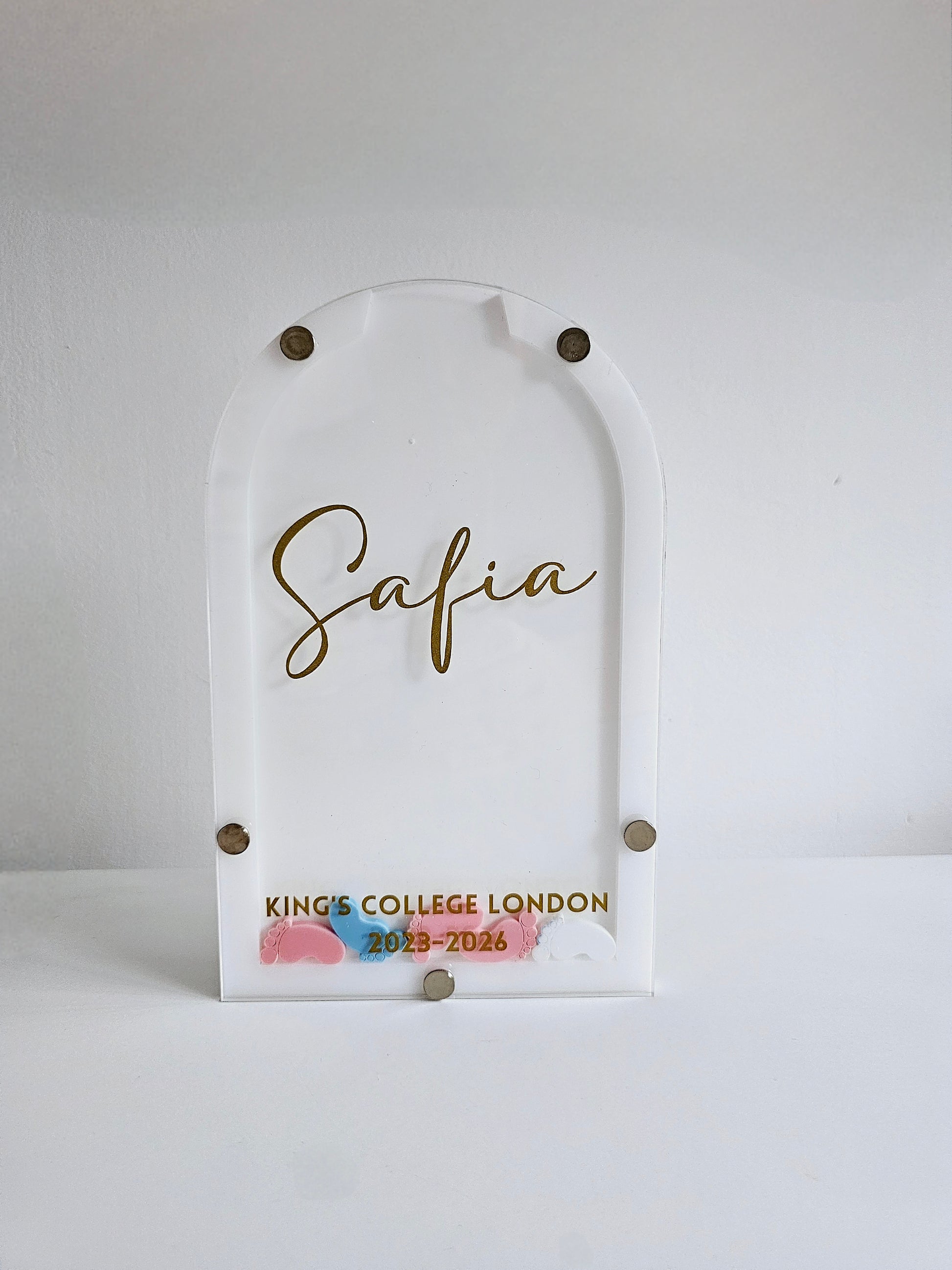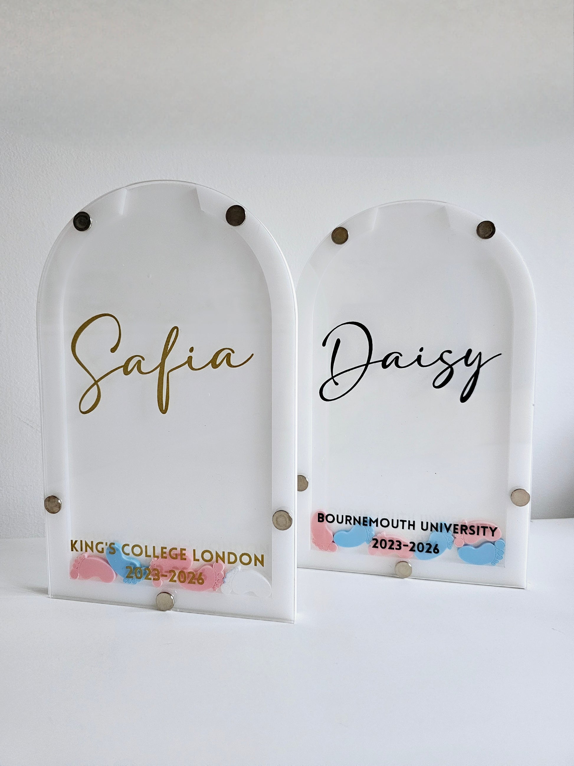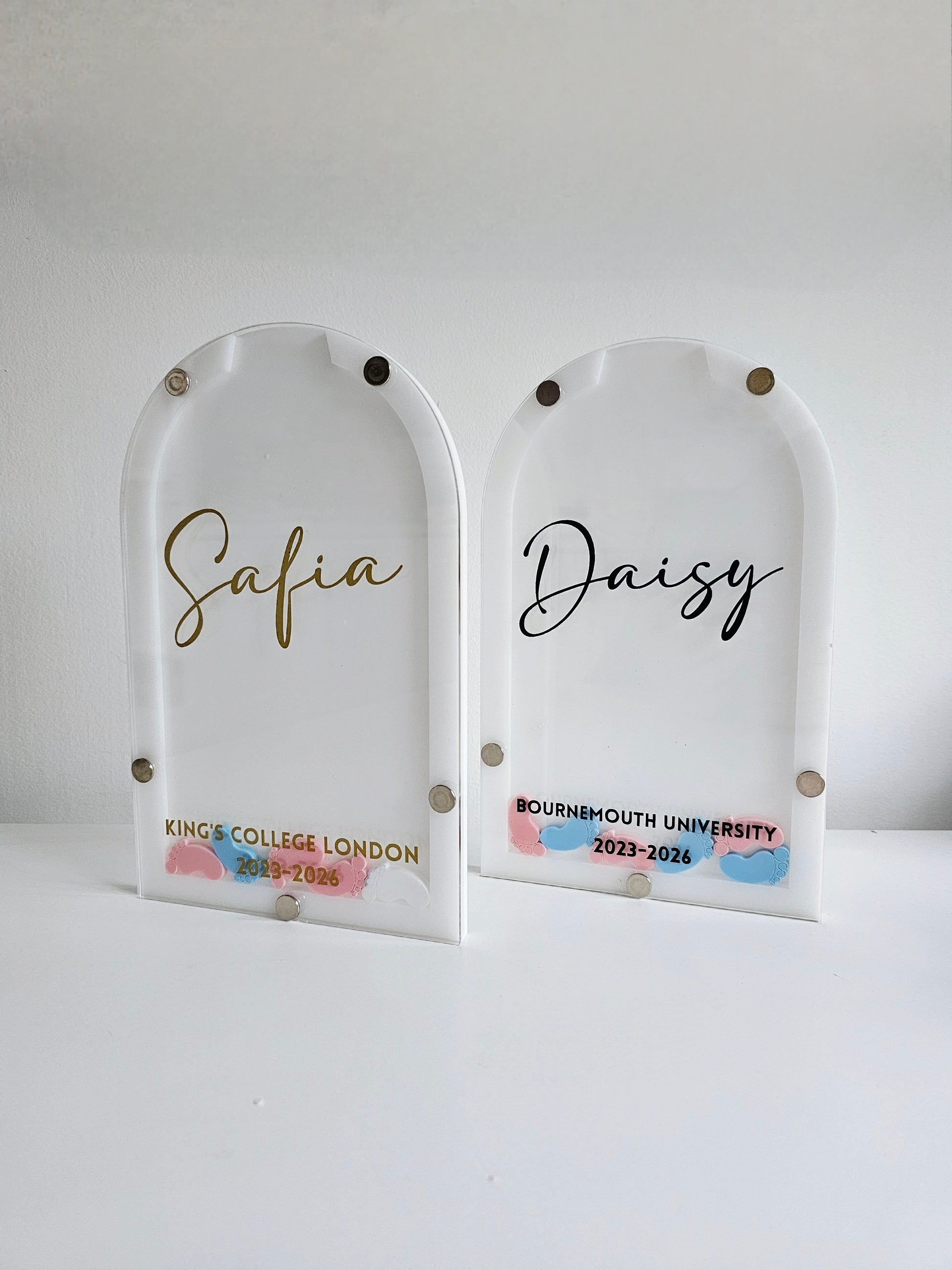 These are free standing and would fit comfortably on a shelf or work unit. And will come personalised with and name sitting pretty in the middle and a university and dates at the bottom.