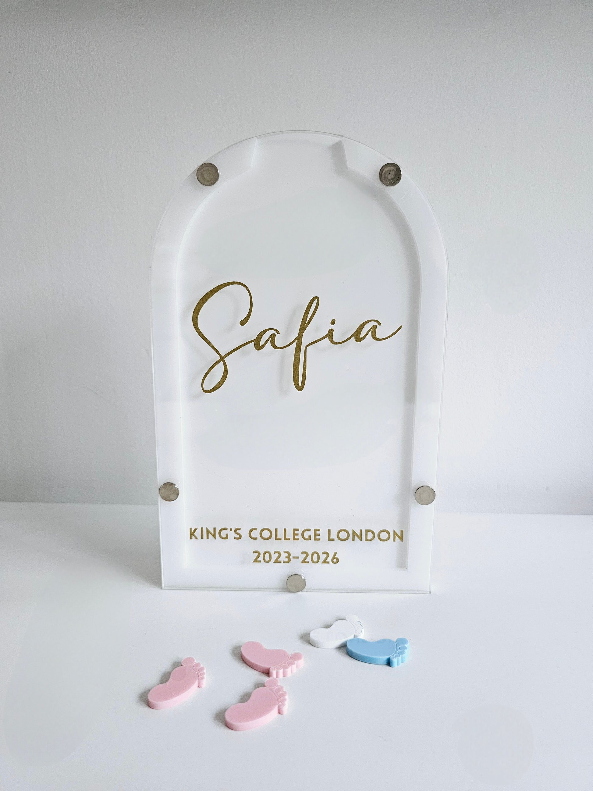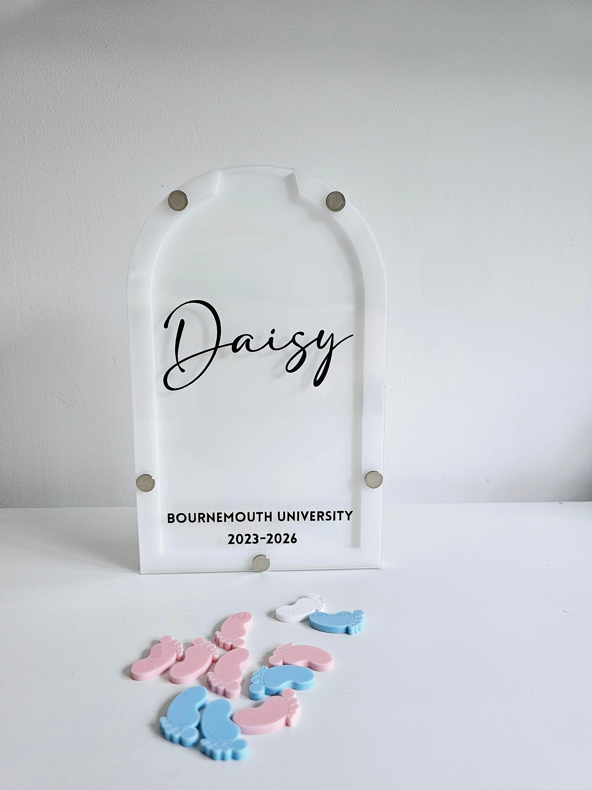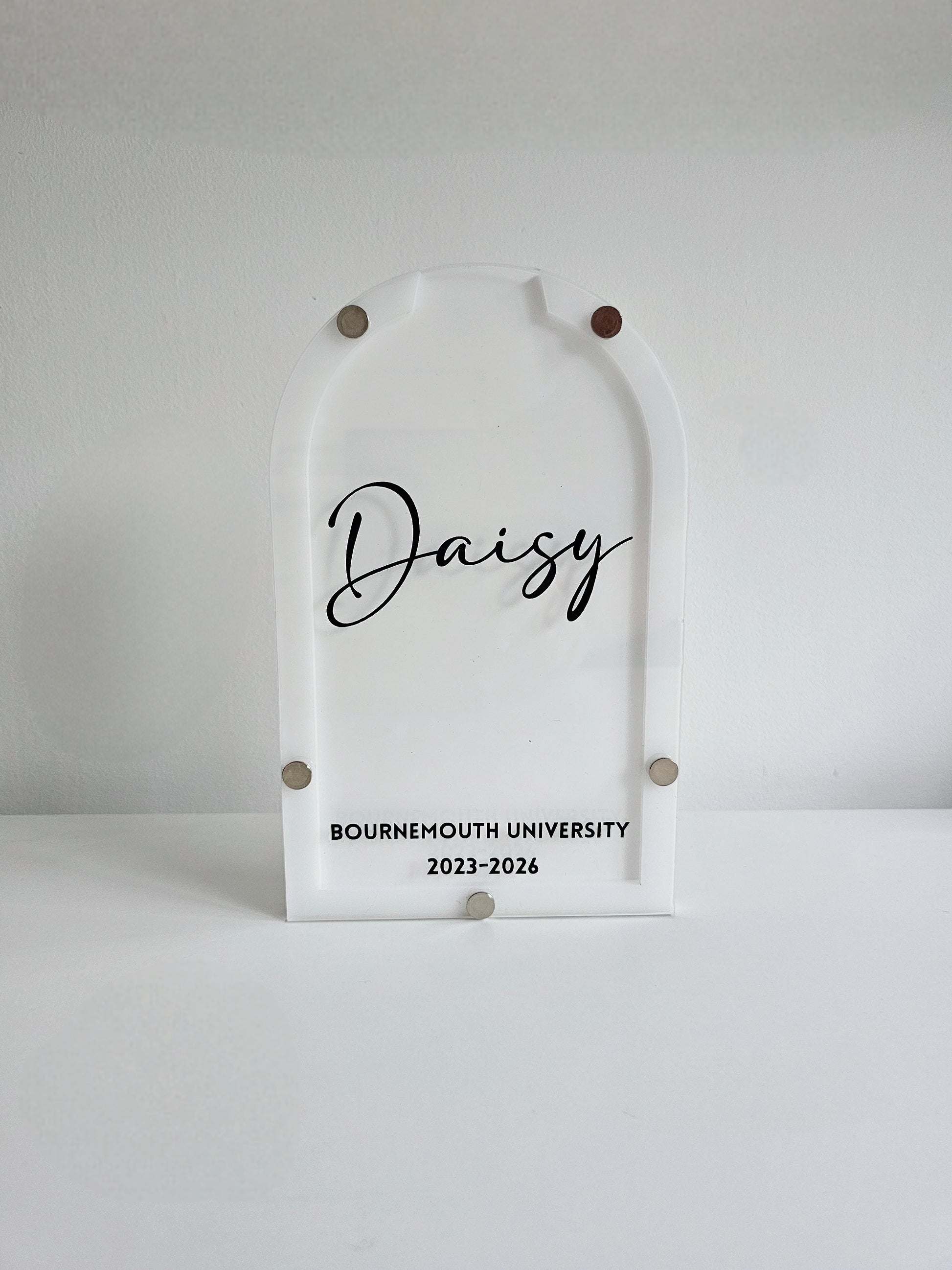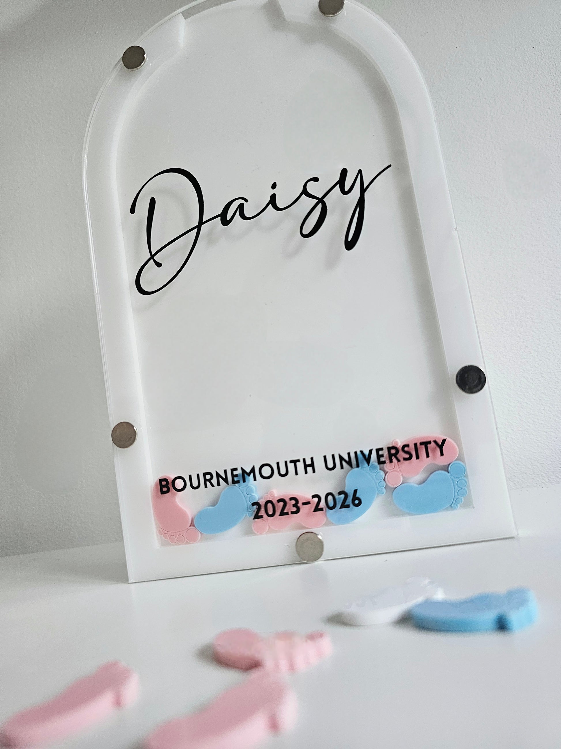These are free standing and would fit comfortably on a shelf or work unit. And will come personalised with and name sitting pretty in the middle and a university and dates at the bottom.